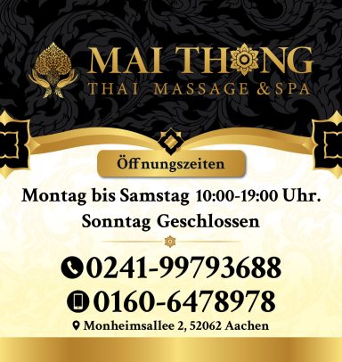 Im Mai Thong Thai Massage & Spa Aachen bringen wir die Wärme und heilende Berührung der traditionellen Thai-Massage ins Herz der Stadt. 🌸